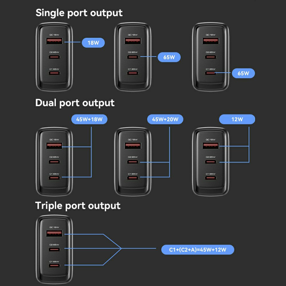• Power USB-C1 + (USB-C2 + USB-A): 45W + 12W;
