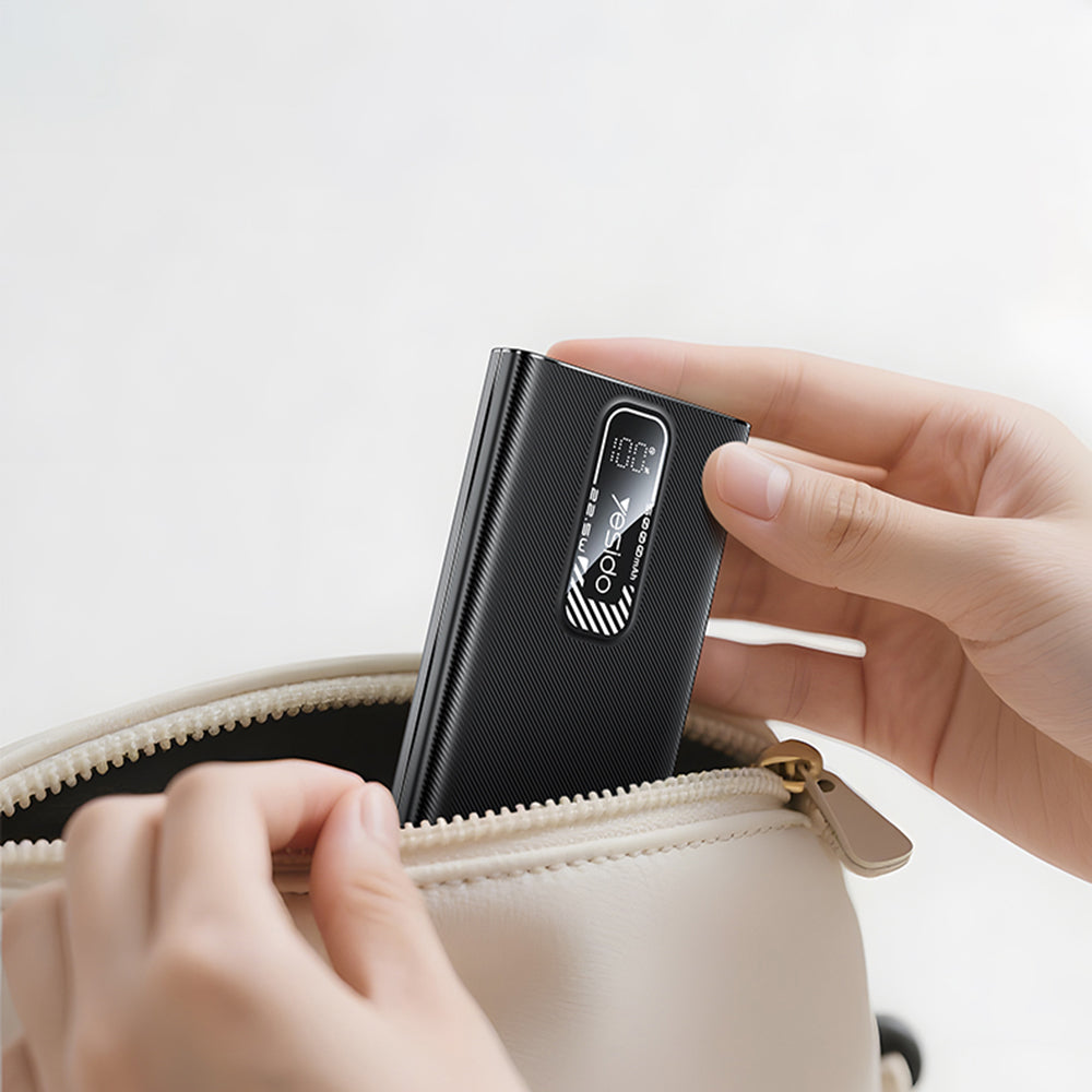 An external battery designed to support device charging during travel, trips, or daily activities. Order the Yesido power bank! Compact design The Yesido power bank has a slim and lightweight design, which allows for easy transport in a pocket, bag, or backpack. Efficient charging The external battery ensures efficient charging of phones and other accessories, maintaining consistent performance in use. Specifications: Materials: ABS, polycarbonate; Ports: USB-A, Type-C, Lightning; Battery capacity: 5000mAh / 3.85V / 19.25Wh; Type-C input: 5V/3A, 9V/2A, 18W Max; Lightning input: 5V/2A, 10W Max; Type-C output: 5V/3A, 9V/2.22A, 12V/1.67A, 10V.2.25A, 20W Max; USB-A output: QC18W; Total output power: 5V/3A, 22.5W Max; Dimensions: 9.6 x 6.2 x 1.47cm.