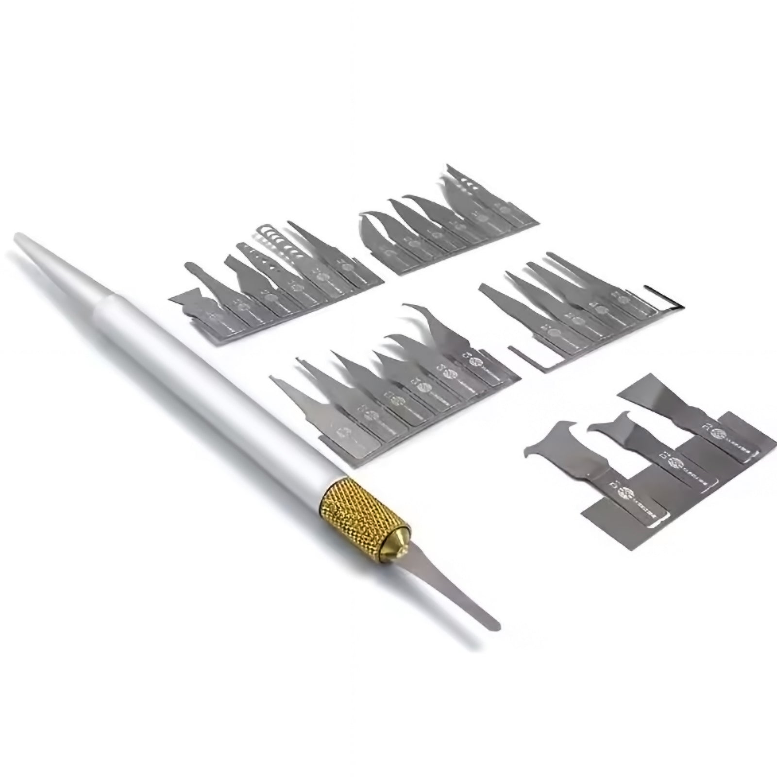 z základních desek mobilních telefonů. Sada obsahuje 27 ultra tenkých čepelí a ergonomickou rukojeť ve tvaru pera,