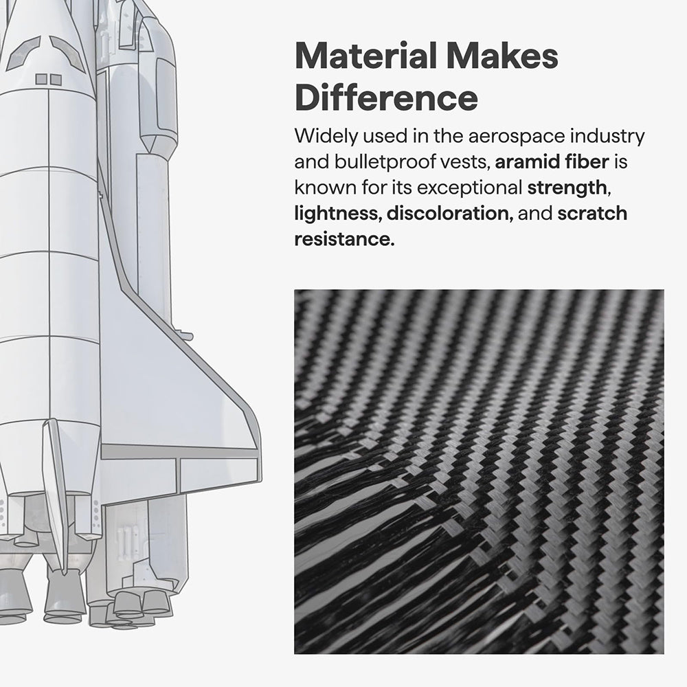 Decentně zvýšený rámeček ve spojení s aramidovou vlákninou, známou pro svou výjimečnou odolnost, jsou cenné atuty proti poškození.