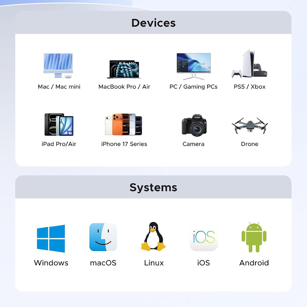 Externí SSD je kompatibilní s Windows, macOS, Linux, iOS a Android a umožňuje přímé připojení bez instalace nebo dalšího nastavení.